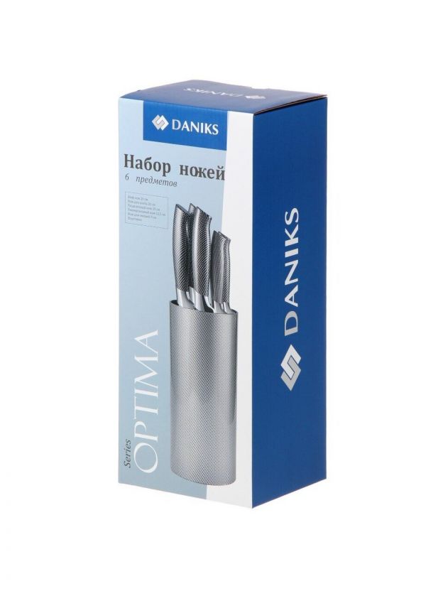 Набор ножей Daniks Оптима 6 предметов: универсальное решение для кухни, дома и дачи. Прочный металл, стильный дизайн, подставка в комплекте — выгодно и надолго.