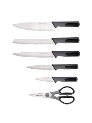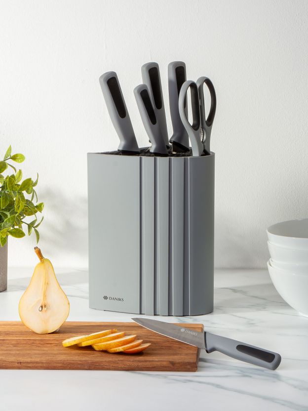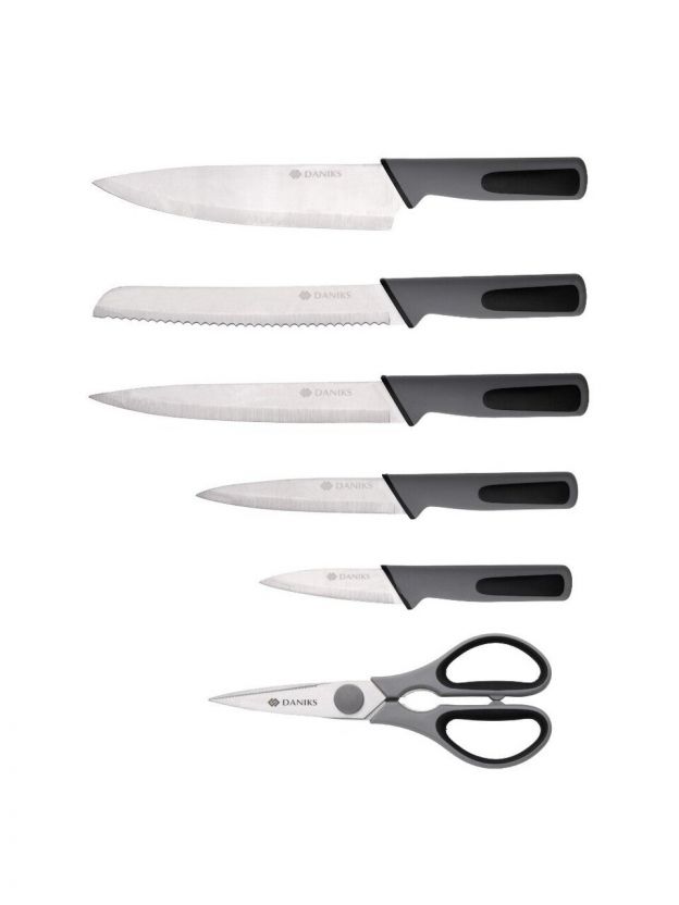 Набор ножей 7 предметов Daniks Aura — стильное и функциональное решение для современной кухни. Серый цвет и лаконичный дизайн гармонично впишутся в любой интерьер, а качественная нержавеющая сталь лезвий обеспечит долгий срок службы и безупречную остроту. В комплекте представлены шеф-нож, нож для овощей, универсальный нож, хлебный нож, разделочный нож и ножницы, что позволит легко справиться с любыми кулинарными задачами. Все предметы удобно размещаются на пластиковой подставке, которая экономит место на рабочей поверхности и поддерживает порядок на кухне.