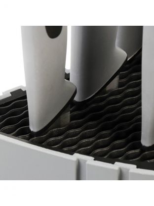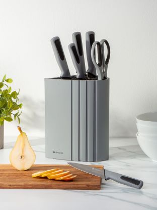 Компактная подставка из прочного пластика надежно удерживает все инструменты, защищая лезвия от повреждений и продлевая срок их службы. Легкий вес набора (1,3 кг) делает его удобным для перемещения и хранения. Благодаря универсальному набору длины лезвий (от 9 до 20 см) легко подобрать подходящий инструмент для нарезки мяса, овощей, хлеба или других продуктов.