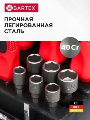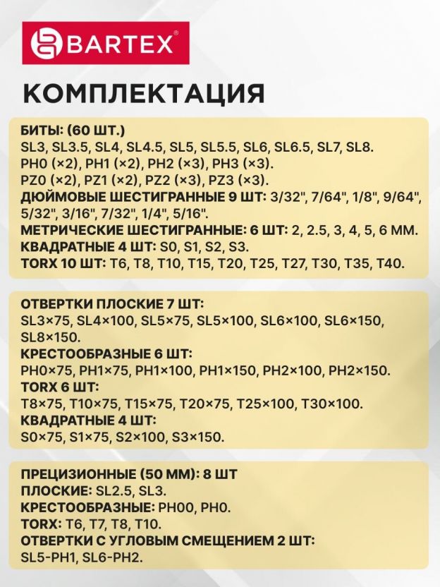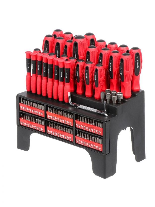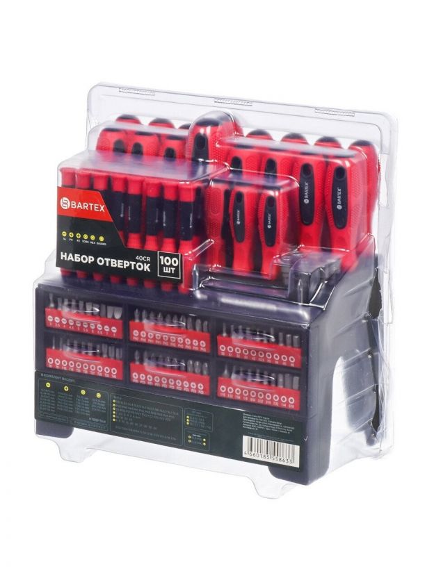 Набор отверток 100 предметов Bartex с насадками – универсальное решение для дома и дачи, сочетающее надежность и функциональность. Такой комплект станет незаменимым помощником при любых ремонтных и монтажных работах. Благодаря широкому ассортименту насадок, магнитным свойствам и прочной конструкции, инструмент обеспечивает точность и удобство при работе с различными видами крепежа. Яркий красный цвет добавляет стильный акцент, а эргономичная форма ручек гарантирует комфорт даже при длительном использовании.