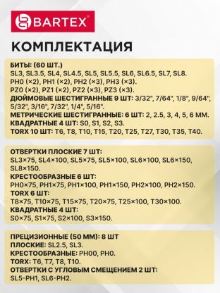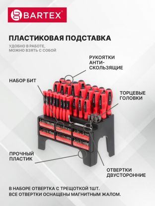 Комплект отверток Bartex с насадками поможет быстро и качественно справляться с ремонтом мебели, сборкой конструкций, обслуживанием техники, монтажом электрики и множеством других задач. Благодаря продуманной комплектации, инструмент экономит время и силы, позволяя легко находить нужную насадку для любой работы. Прочные материалы гарантируют долгий срок службы, а магнитные свойства делают процесс работы более быстрым и аккуратным. Такой набор станет отличным выбором для тех, кто ценит удобство, надежность и профессиональный подход к любым домашним задачам.