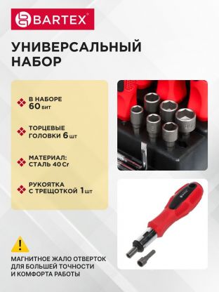 Покупка набора отверток Bartex – это выгода, заключающаяся в универсальности и экономии: один комплект решает множество задач, избавляя от необходимости приобретать отдельные инструменты. Надежность бренда и качество исполнения обеспечивают уверенность в результате. Идеальное решение для тех, кто стремится к порядку и эффективности в домашнем хозяйстве.
