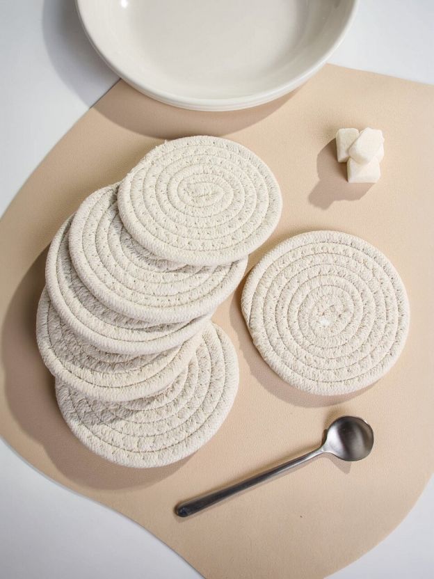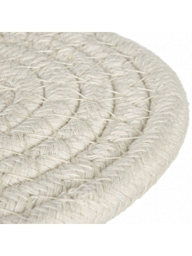 Подставки выполнены из плотного плетёного материала, устойчивого к нагреву и влаге. Размер каждой — 10 см, что позволяет использовать их под большинство чаш и посуды.
