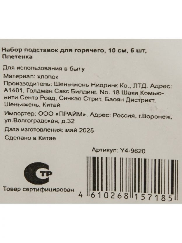 В комплекте 6 подставок, каждая диаметром 10 см. Это удобно для сервировки стола на семью или небольшую компанию.