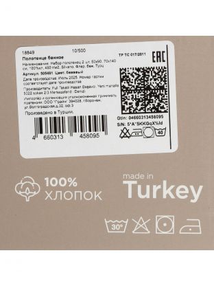 В комплекте два полотенца: 50х90 см (для лица и рук) и 70х140 см (банное). Оба — из 100% хлопка, плотность 450 г/м2.