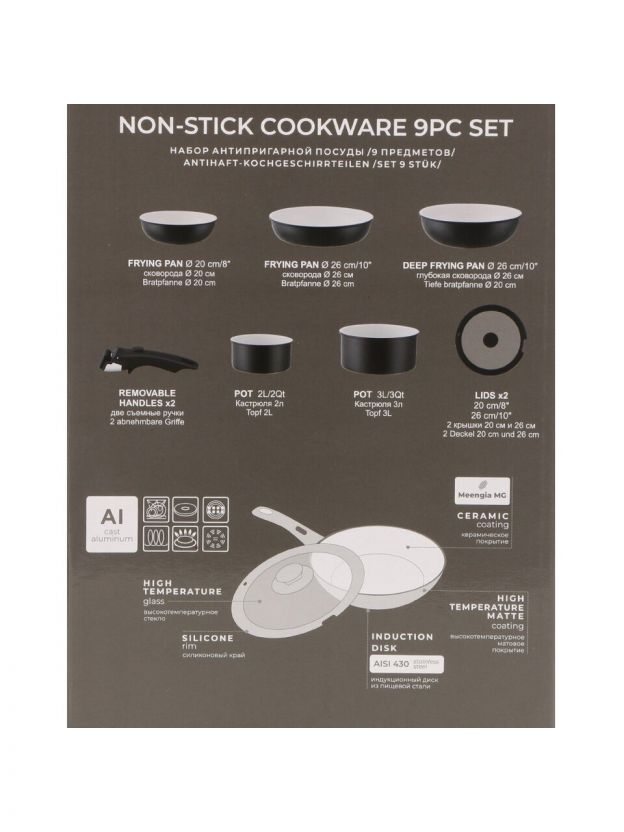 В наборе: сковорода 20x5.5 см, сковорода 26x6 см, глубокая сковорода 26x8 см, кастрюля 2 л (18x8.5 см), кастрюля 3 л (20x10 см), 2 съемные ручки, 2 крышки (20 и 26 см). Все предметы выполнены из литого алюминия с керамическим покрытием внутри.