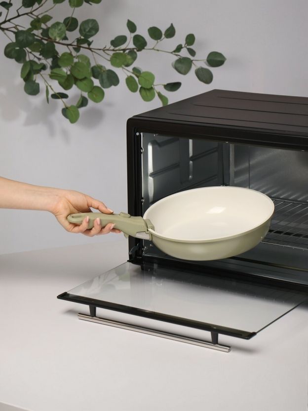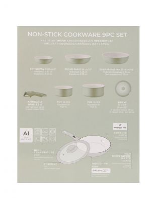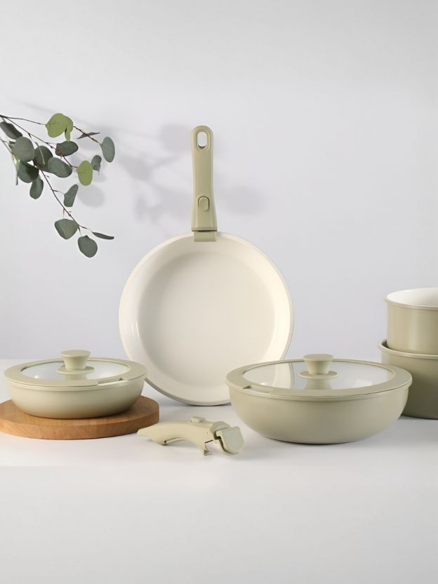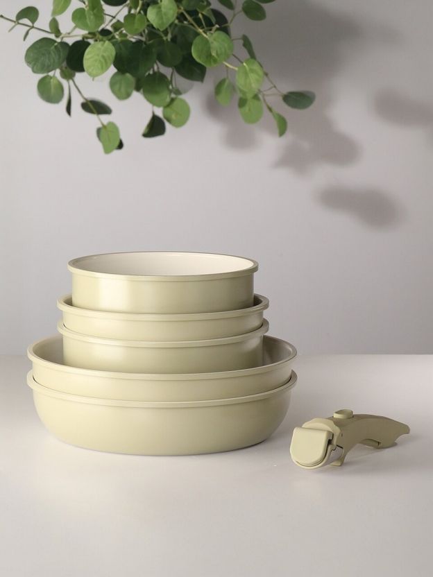 В наборе: сковороды 20x5,5 см, 26x6 см, глубокая сковорода 26x8 см, кастрюля 2 л (18x8,5 см), кастрюля 3 л (20x10 см), две съемные ручки и две крышки (20 и 26 см). Все предметы можно мыть в посудомоечной машине.