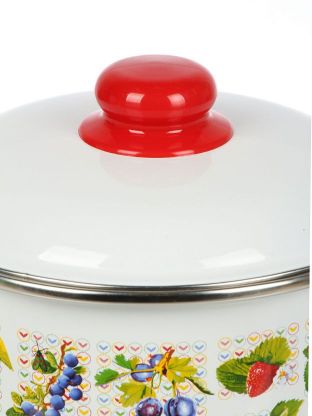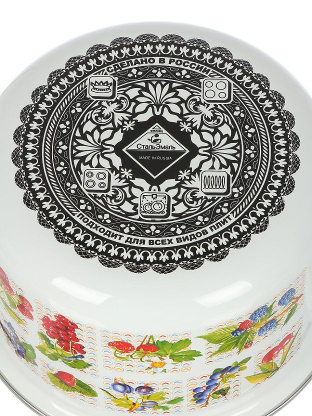 - Эстетика и универсальность: белая эмалированная сталь с ярким дизайном «Вкус лета» подходит для всех типов плит, включая индукционные.
