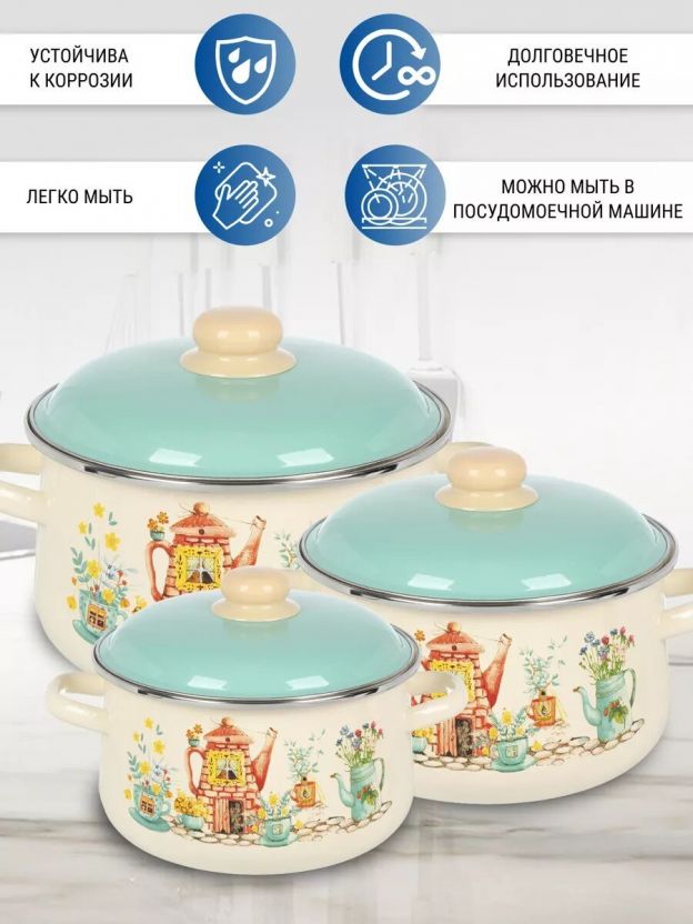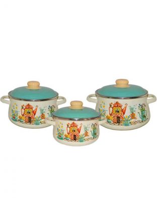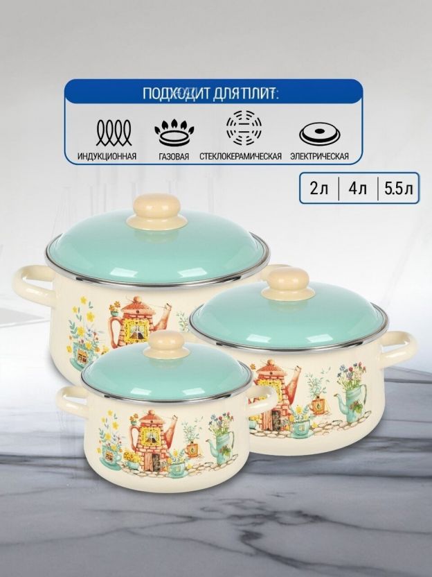 Набор посуды эмалированная сталь, 3 предмета, 2, 4, 5.5 л, индукция, СтальЭмаль, Чайный домик, 1с408