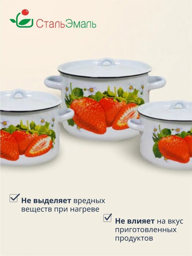 Набор эмалированных кастрюль 1.5/2.9/4.5 л СтальЭмаль Клубника садовая — универсальное решение для индукции, дома и дачи по выгодной цене