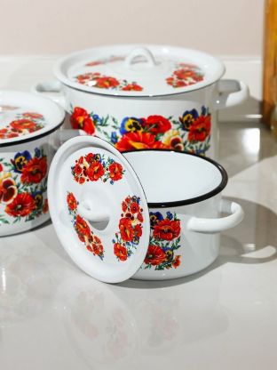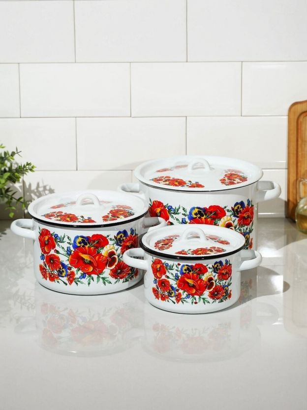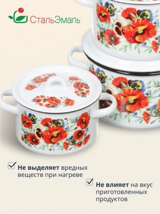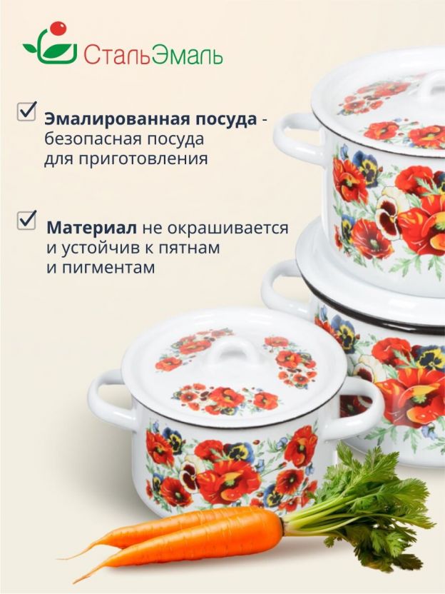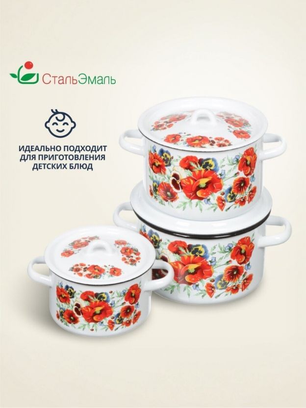Набор эмалированных кастрюль СтальЭмаль Маки мечта: 3 размера (1.5, 2.9, 4.5 л), подходит для индукции, идеален для дома и дачи, выгодная цена.