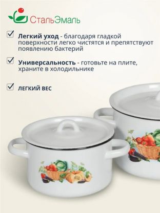 Посуда Стальэмаль рассчитана на длительный срок эксплуатации. Она подходит для любых видов плит и посудомоечных машин. Прочный корпус из холоднокатаного стального проката гарантирует эффективную тепловую обработку пищи. Благодаря двойному слою эмалевого покрытия исключается проникновение в пищу оксидов металла. Покрытие инертно и устойчиво к пищевым кислотам, не вступает во взаимодействие с продуктами и не искажает их вкусовые качества.