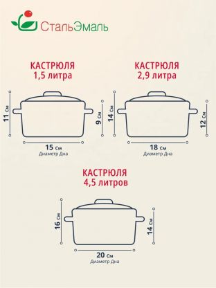 Эмалированный набор кастрюль 3-в-1: оптимальные объёмы 1.5/2.9/4.5 л для индукции и любых плит. Надёжно, недорого, удобно для дома и дачи.