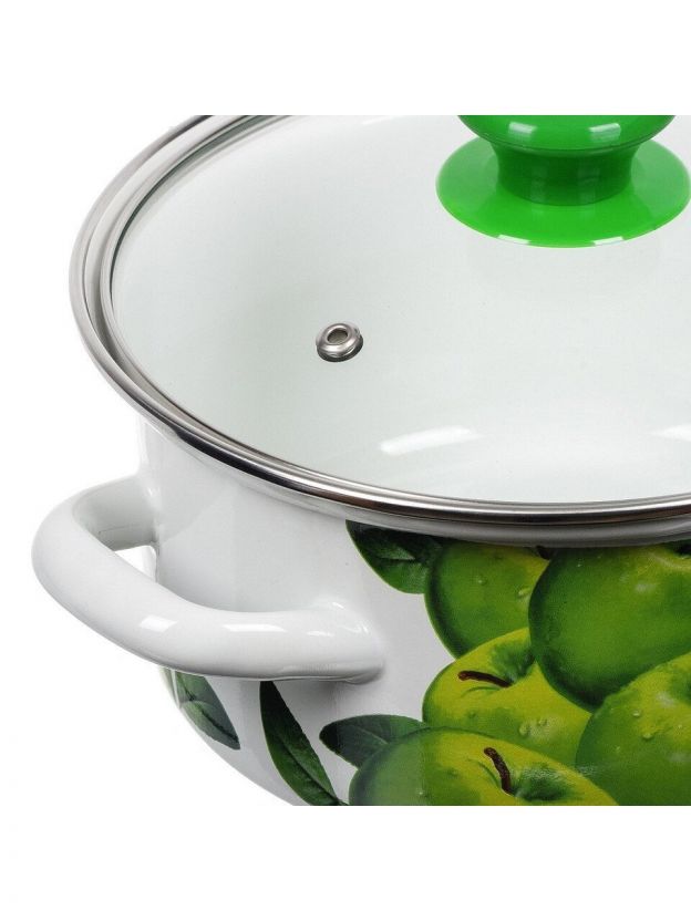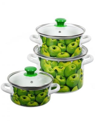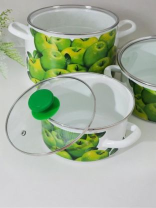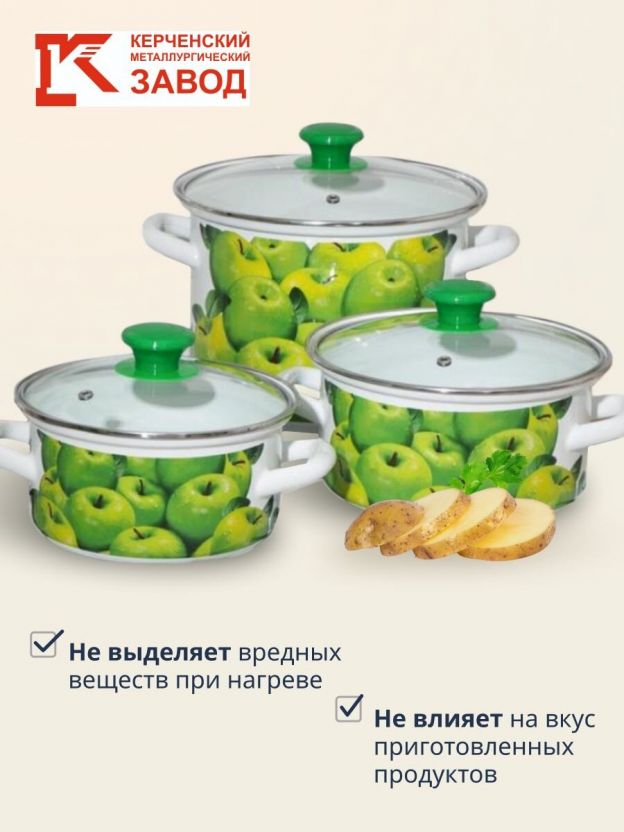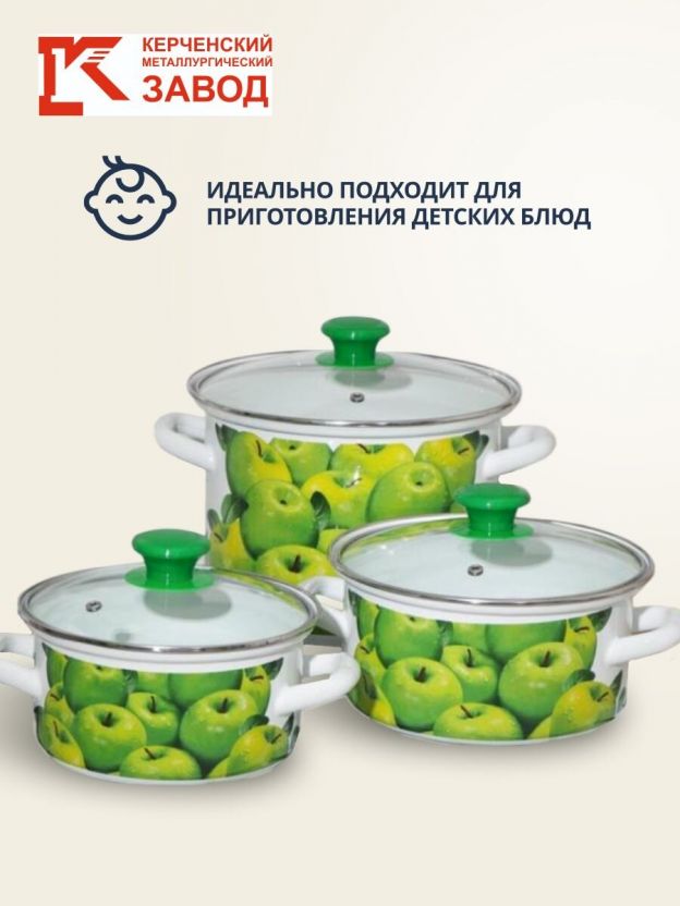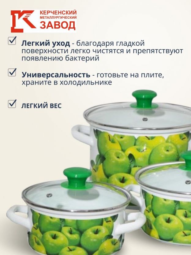 Набор посуды эмалированная сталь, 6 предметов, МП, кастрюли 1.5,2.3,5 л, Керченский металлургический завод, Поздние яблоки 5-1-Экстра, белый