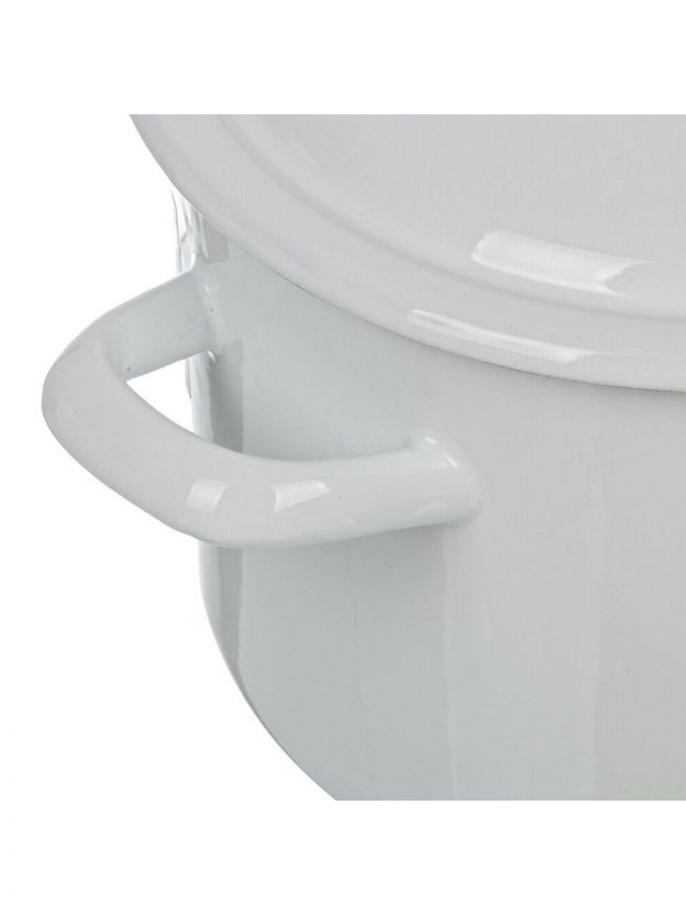 - Надёжность: прочная эмалированная сталь, три кастрюли разного объёма (1.45, 2.9, 4.3 л), крышки из стали в комплекте