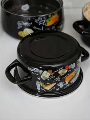 Три оптимальных объёма (1.5, 2.3, 5 л): удобно для семьи любого размера, материал — эмалированная сталь с прочной стеклянной крышкой