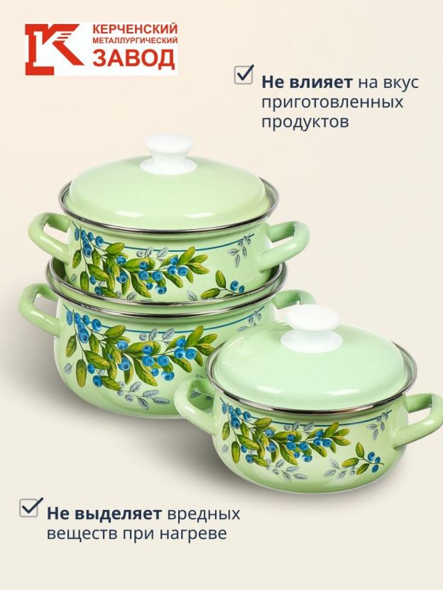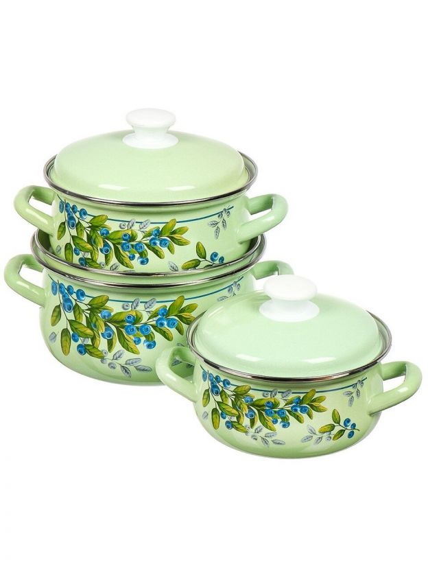 Набор посуды эмалированная сталь, 6 предметов, кастрюли 1.5, 2, 3 л, Керченский металлургический завод, Черника-1, салатовый