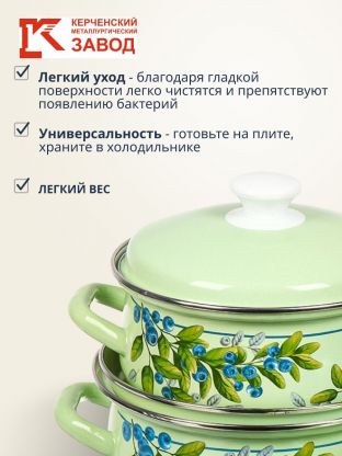 Набор посуды из эмалированной стали «Черника-1» — это сочетание прочности и экологичности. Эмалированная сталь не впитывает запахи и устойчива к коррозии, что важно для хранения и приготовления разных блюд. Если вы ищете, какую кастрюлю выбрать для повседневной готовки или подарка, обратите внимание на этот комплект — он рассчитан на долгий срок службы без потери внешнего вида.