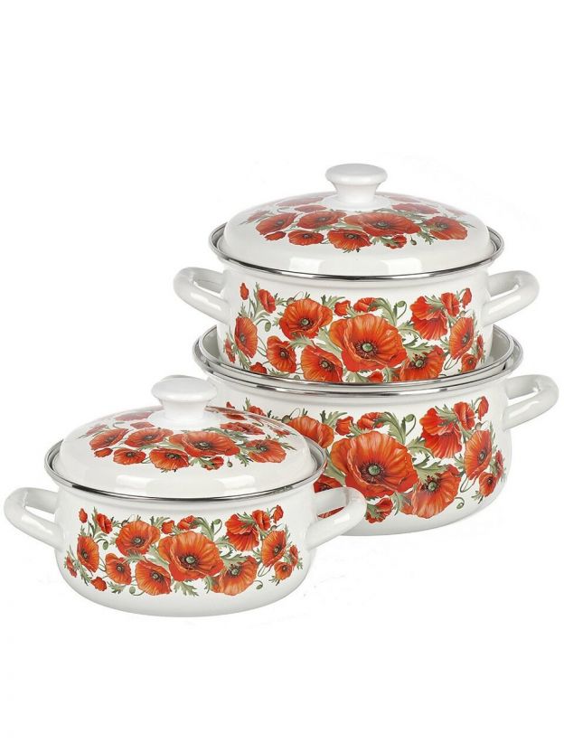 Набор посуды эмалированная сталь, 6 предметов, кастрюли 2, 3, 4 л, Daniks, Маковый цвет-1