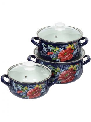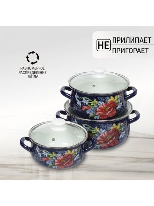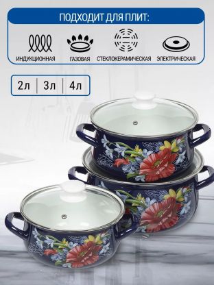 Как использовать набор? Кастрюли на 2, 3 и 4 литра подойдут для супов, каш, варки компотов или заготовок. Можно ли мыть в посудомоечной машине? Нет, рекомендуется ручная мойка для сохранения эмали. Чем отличается этот набор от аналогов? В отличие от некоторых моделей, здесь нет антипригарного слоя, что делает посуду экологичнее и долговечнее. Подходит ли для индукционных плит? Да, совместимость заявлена для всех типов плит, включая индукционные, что удобно для современных кухонь.