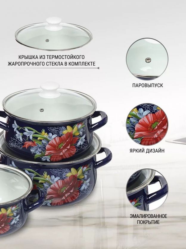 Выбирая этот набор эмалированной посуды, вы получаете надежный комплект для разных задач — от ежедневной готовки до праздничных застолий. Закажите сейчас, чтобы получить выгодную цену и быть уверенными в качестве российского производства.