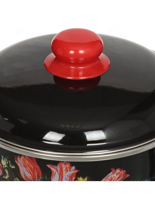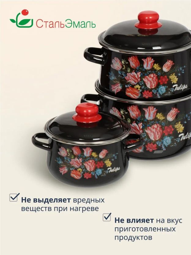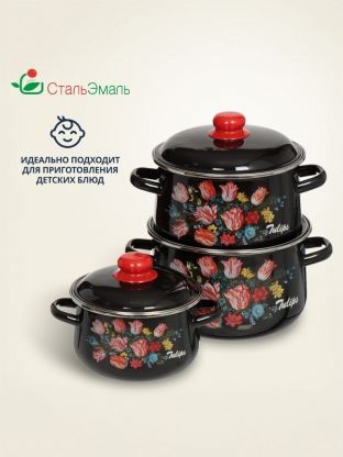 Набор кастрюль эмалированная сталь 6 предметов СтальЭмаль «Букет тюльпанов»: для индукции, газовых и электрических плит — долговечная посуда для всей семьи. Почему выбирают: Уникальный дизайн: стильная коллекция «Букет тюльпанов» украсит любую кухню и станет отличным подарком Надёжная эмалированная сталь: кастрюли объёмом 2, 4 и 5,5 л с долговечными стальными крышками, подходят для индукционных плит Универсальность: идеальны для дома, дачи, подарка — готовьте супы, каши и вторые блюда для всей семьи Набор посуды из эмалированной стали СтальЭмаль «Букет тюльпанов» — это практичный выбор для тех, кто ищет, какую посуду купить для индукционной плиты или как выбрать кастрюли для ежедневного использования. Эмалированная сталь устойчива к коррозии и легко очищается, а стильный черный цвет с ярким декором впишется в любой интерьер. В комплекте три кастрюли объёмом 2, 4 и 5,5 литра — оптимальный набор для приготовления разных блюд на семью. В отличие от алюминиевых или стеклянных аналогов, эмалированные кастрюли не впитывают запахи и подходят для хранения пищи. Благодаря совместимости с газовыми, электрическими, стеклокерамическими и индукционными плитами, этот набор — универсальное решение для кухни в квартире или на даче. Ответ на популярный вопрос «подходит ли для индукции» — да, благодаря специальному дну. Если вы ищете, какая посуда лучше для подарка, обратите внимание на этот комплект: сочетание эстетики и практичности оценят все. Закажите набор кастрюль СтальЭмаль по выгодной цене уже сейчас — получите универсальную посуду, которая прослужит долгие годы и украсит вашу кухню. Частые вопросы: Можно ли использовать этот набор на индукционной плите? Да, кастрюли из набора полностью совместимы с индукционными плитами, а также с газовыми, электрическими и стеклокерамическими поверхностями. Чем выгоден набор из трёх кастрюль разного объёма? Вы сможете готовить как небольшие порции, так и большие блюда на всю семью или компанию, экономя место и средства на покупке отдельных кастрюль. Какой материал используется и есть ли антипригарное покрытие? Корпус и крышки выполнены из эмалированной стали, антипригарного покрытия нет — это обеспечивает долговечность и безопасность при приготовлении пищи.