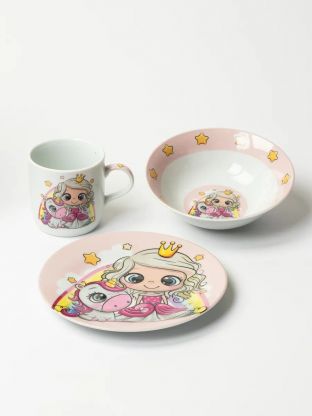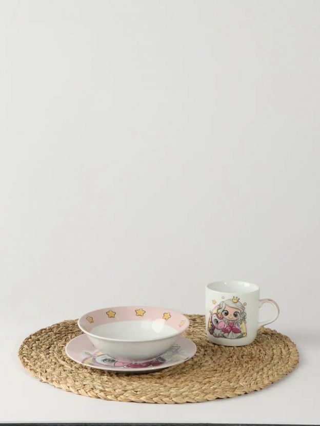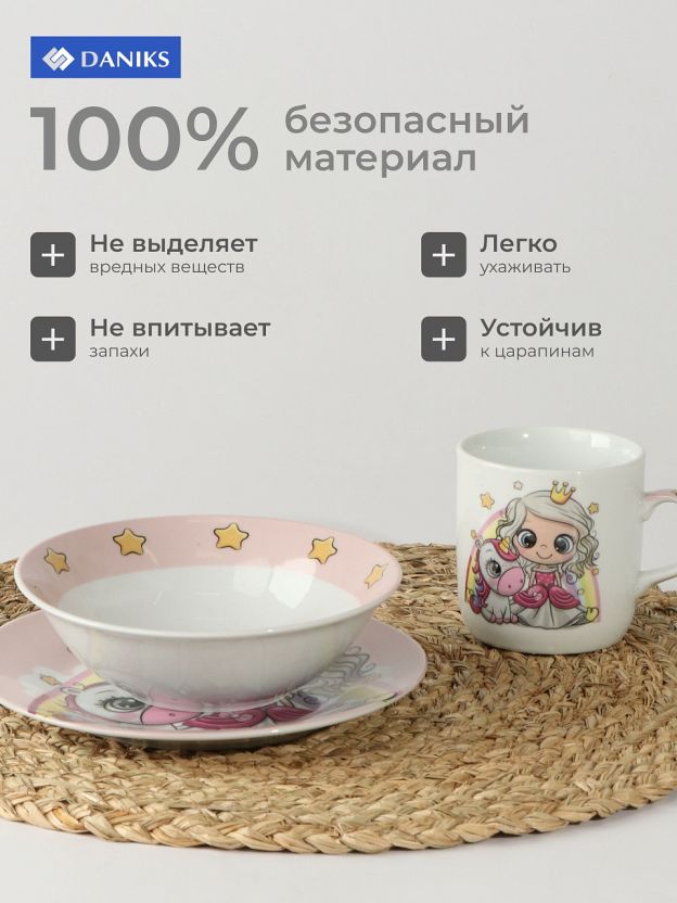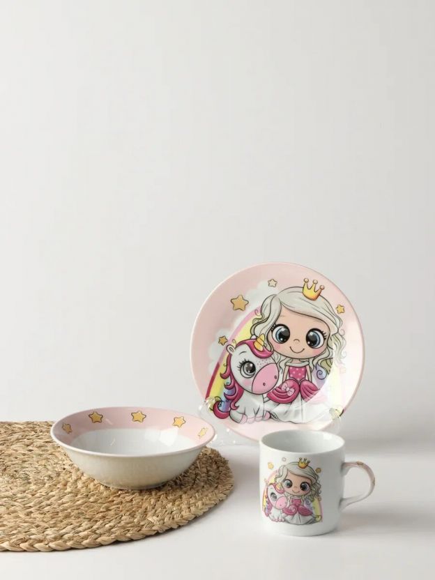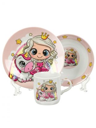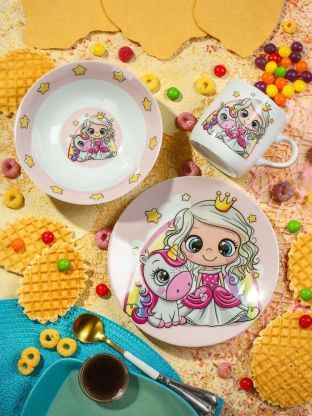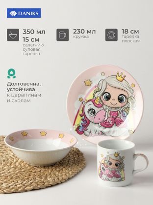 Набор посуды керамика, 3 шт, Принцесса и единорог, тарелка 17.5/18 см, салатник 15 см, кружка 230 мл, Daniks
