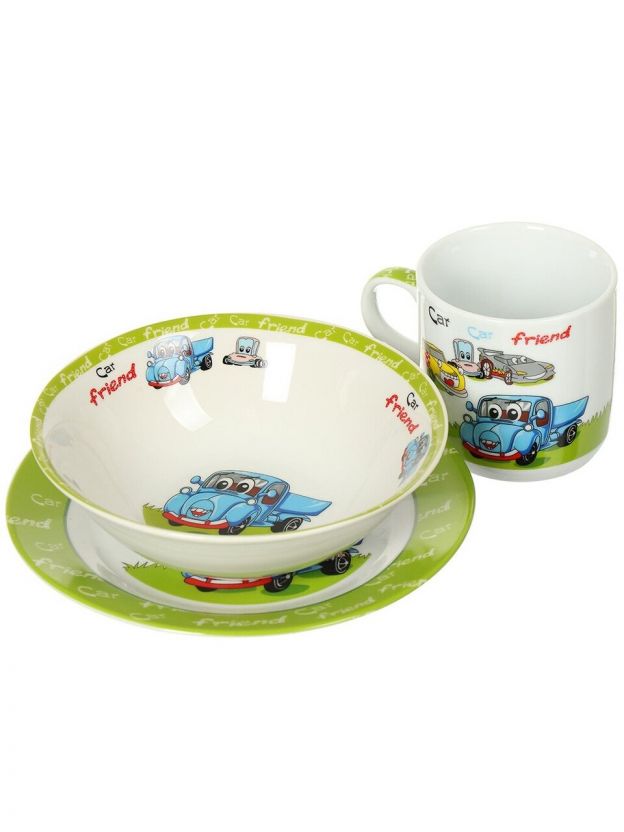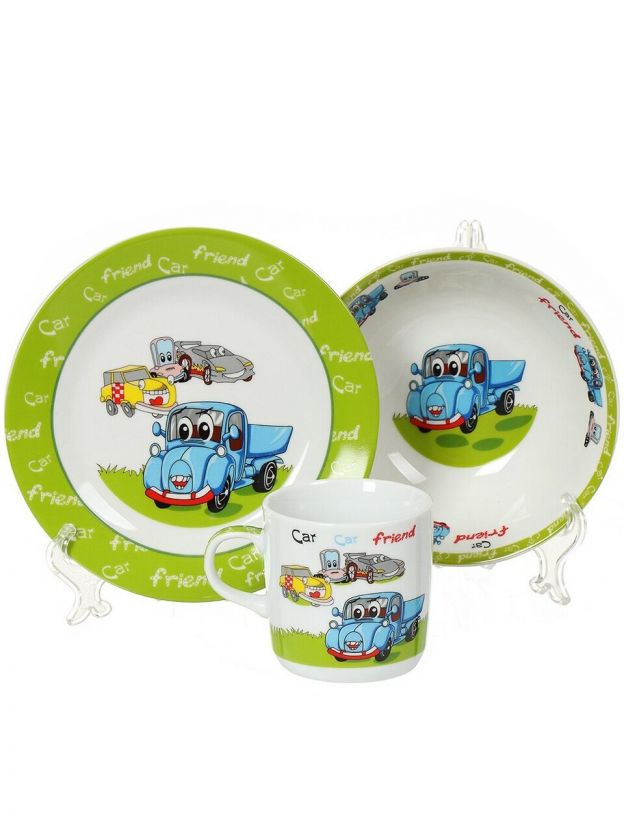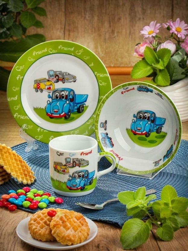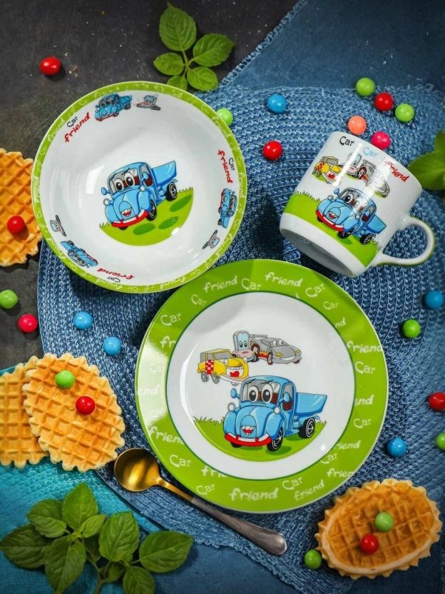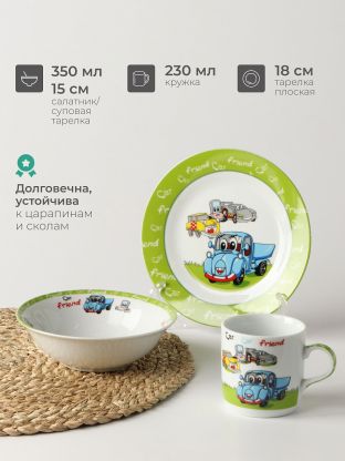 В комплект входят тарелка диаметром 18 см, салатник 15 см объемом 350 мл и кружка 230 мл. Все предметы набора выполнены из прочной керамики, которая устойчива к сколам и легко очищается. Посуда подходит для использования в микроволновой печи и мытья в посудомоечной машине, что делает уход за ней максимально простым и удобным. Яркая подарочная упаковка превращает набор в готовое решение для подарка, который обязательно вызовет восторг у ребенка и его родителей.