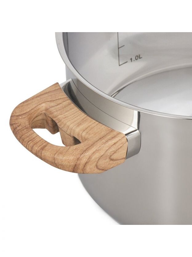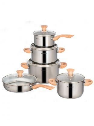 В комплект входят кастрюли объёмом 2.9, 3.9 и 6 литров, ковш 2.1 л, сковорода диаметром 24 см. Все крышки — из термостойкого стекла с паровым клапаном.