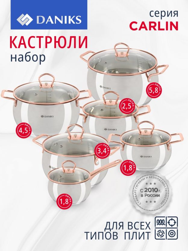 Набор посуды нержавеющая сталь, 12 предметов, кастрюли 1.8, 2.5, 3.4, 4.5, 5.8 л, ковш 1.8 л, индукция, Daniks, Карлин, GS-01332G-12SE