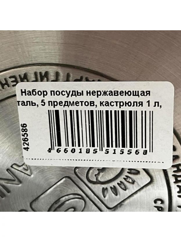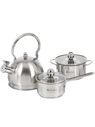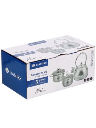 Набор посуды нержавеющая сталь, 5 предметов, кастрюля 1 л, ковш 0.8 л, чайник 2 л, индукция, Daniks, GS-01311A-5PC