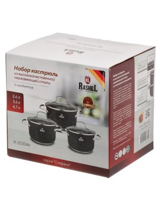 Набор посуды нержавеющая сталь, 6 предметов, 2.6, 3.6, 4.7 л, индукция, RasheL, R-20304v