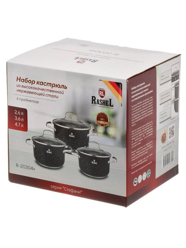 Набор кастрюль RasheL R-20304v — это современное решение для кухни, где ценят удобство и прочность. Нержавеющая сталь устойчива к коррозии, не впитывает запахи и легко очищается. В комплекте три кастрюли объёмом 2.6, 3.6 и 4.7 литра, что позволяет готовить как небольшие порции, так и блюда для большой компании. Стеклянные крышки с пароотводом обеспечивают визуальный контроль за процессом приготовления.