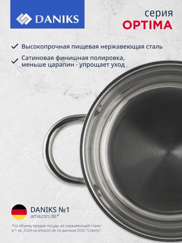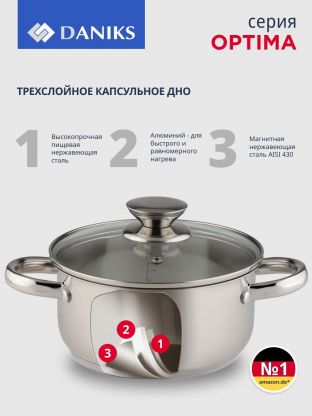 Набор посуды Daniks Оптима из нержавеющей стали на 6 предметов: универсальный выбор для индукции и любых плит, долговечность, выгодная цена. Почему выбирают: Универсальность: подходит для всех типов плит, включая индукционные, газовые и электрические Безопасные материалы: прочная нержавеющая сталь, стеклянные крышки, ручки из стали — рассчитано на долгий срок службы Идеален для дома, дачи и подарка: 3 кастрюли разного объёма и ковш — оптимальное решение для любых кулинарных задач Набор посуды Daniks Оптима (GS-01201-6S) — это 6 предметов из первоклассной нержавеющей стали с тремя кастрюлями на 1.5, 3.1 и 5.4 литра. Такой набор часто ищут как «купить недорого набор кастрюль для дачи» или «что лучше для индукционной плиты». Высокопрочная сталь устойчива к коррозии и не впитывает запахи, а стеклянные крышки позволяют контролировать процесс приготовления. Если вы спрашиваете «подходит ли для индукционных плит» или «чем отличается от аналогов», обратите внимание: у большинства наборов других производителей нет такого универсального сочетания объёмов и совместимости с разными плитами. Отсутствие антипригарного покрытия — плюс для тех, кто предпочитает натуральные материалы без риска выделения вредных веществ. Как использовать набор? Он подойдёт для повседневной готовки, заготовок, приготовления супов, каш, варенья. Благодаря разным объёмам легко подобрать оптимальный размер кастрюли для семьи или компании на даче. Прочная конструкция и стальные ручки выдерживают частое использование и мытьё в посудомоечной машине. Оформите заказ сейчас и получите универсальный набор посуды Daniks Оптима с доставкой. Гарантия на сталь, выгодная цена и проверенное качество — идеальный выбор для вашей кухни. Частые вопросы: Для каких плит подходит этот набор? Набор кастрюль Daniks Оптима совместим с индукционными, газовыми, электрическими и стеклокерамическими плитами. Подходит для всех современных кухонь. Чем выгоден набор для дачи или подарка? В комплекте кастрюли трёх размеров и ковш — удобно готовить на семью или гостей. Сталь не ржавеет, а универсальный дизайн подойдёт для любого интерьера. Какой объём у каждой кастрюли? В наборе три кастрюли: 1.5 литра, 3.1 литра и 5.4 литра. Все крышки — из закалённого стекла, ручки — из стали, что обеспечивает долговечность и безопасность.