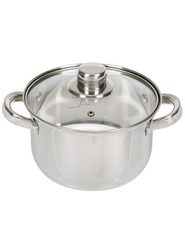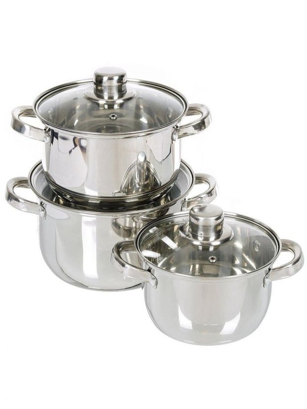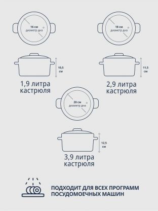 В комплекте три кастрюли объемом 1.9, 2.9 и 3.9 литра, каждая с отдельной стеклянной крышкой.