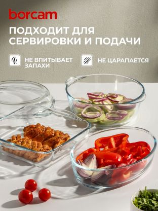Набор жаропрочной посуды Borcam 3 шт: стекло, овальная форма, крышка — для духовки, СВЧ, посудомойки. Идеально для запекания и сервировки. Почему выбирают: Стекло Borcam выдерживает резкие перепады температур и не впитывает запахи — безопасно для здоровья Три формы разного объёма (2 л, 2 л, 1,5 л) с крышкой — удобно для запекания курицы, рыбы, выпечки Многофункциональность: подходит для дома, дачи, подарка, легко мыть в посудомоечной машине Набор жаропрочной посуды Borcam из 3 предметов — идеальное решение для тех, кто ищет, какую посуду выбрать для духовки и микроволновки. Овальные формы из прочного стекла (объём 2, 2 и 1,5 литра) подходят для запекания курицы, рыбы, куличей и других блюд. Крышка в комплекте помогает сохранять сочность и аромат, а прозрачный материал позволяет контролировать процесс готовки без открытия. Многие спрашивают, чем отличается стеклянная жаропрочная посуда от металлической или керамической. Стекло Borcam не вступает в реакцию с продуктами, не окрашивается и не впитывает запахи, что особенно важно для аллергиков и семей с детьми. Формы подходят для использования в СВЧ и духовке, их можно мыть в посудомойке, что экономит время. В отличие от аналогов без крышки, этот набор сохраняет свежесть блюда дольше. Как использовать набор? Просто выберите подходящий размер формы, поместите продукты, накройте крышкой и отправьте в духовку или микроволновку. Благодаря овальной форме посуда занимает минимум места на полке и в холодильнике. Закажите набор Borcam прямо сейчас — получите универсальную посуду для любых блюд, которая прослужит долгие годы. Бесплатная доставка и гарантия оригинальности товара. Частые вопросы: Можно ли использовать эти формы для выпечки хлеба и куличей? Да, набор включает формы объёмом 2 и 1,5 литра, которые отлично подходят для выпечки хлеба, куличей, запекания мяса и рыбы. Стекло выдерживает высокие температуры и не трескается при перепадах. Подходит ли для мытья в посудомоечной машине и использования в микроволновке? Да, посуда Borcam совместима с посудомойкой и СВЧ. Это экономит ваше время и упрощает уход за формами. Какой размер у самой большой формы в наборе? Максимальный объём — 2 литра, диаметр 21 см, высота 8 см. Все формы овальные, что удобно для запекания целой курицы или крупной рыбы.