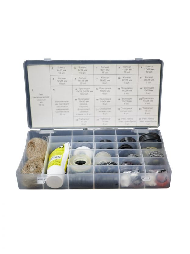 Универсальный набор предназначен для замены изношенных колец фитингов металлопластиковой трубы, кран-буксы, отечественных смесителей, латунных американок. Набор упакован в специальный прозрачный пластиковый кейс с разделителями, благодаря чему прокладки удобной переносить и хранить.