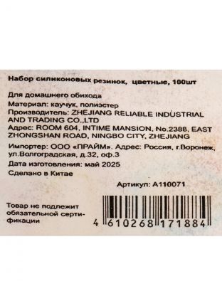 В упаковке 100 цветных резинок, выполненных из силикона, каучука и полиэстера. Это обеспечивает эластичность и прочность — резинки не рвутся при натяжении и не теряют форму.