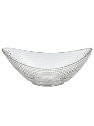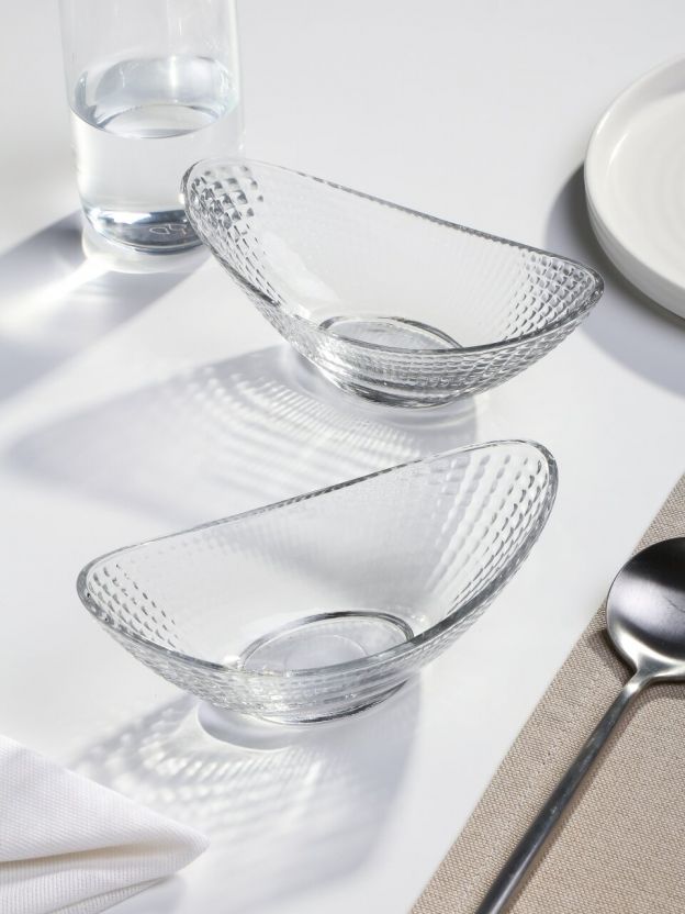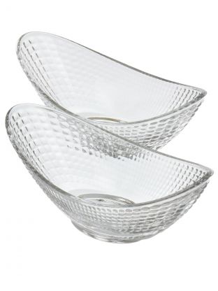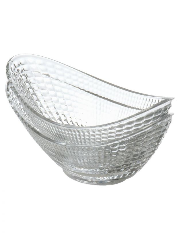 Салатники изготовлены из прозрачного стекла, имеют овальную форму и украшены рельефным узором. В наборе 2 штуки, крышки и металлическая подставка не входят в комплект.