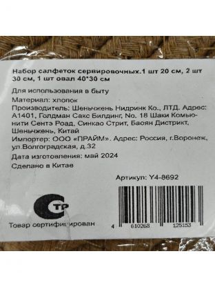 Набор салфеток овальный, 4 шт, 1 шт овал-40х30, 2 шт-30 см, 1 шт-20 см, Y4-8692