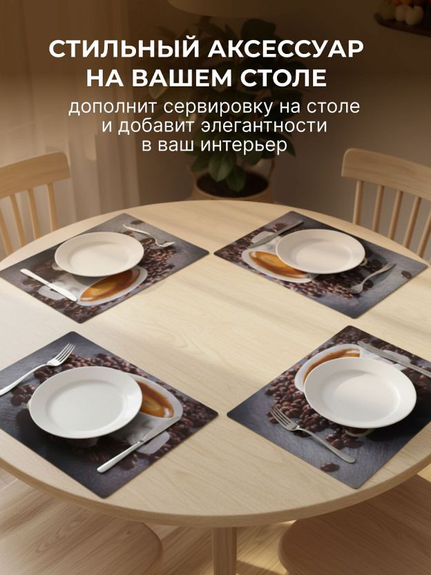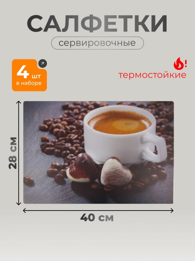 Элегантный набор салфеток для стола из пластика 40х28 см — стильное решение для кухни и гостиной. Коричневый цвет и дизайн «Кофе» украсят интерьер и защитят поверхность стола от пятен и царапин. Практичный комплект из 4 прямоугольных салфеток легко моется и подходит для ежедневного использования.
