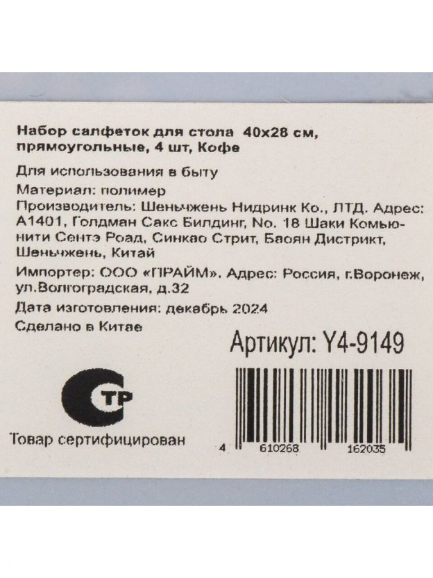 Набор салфеток пластик, 40х28 см, прямоугольный, 4 шт, для стола, Кофе, Y4-9149