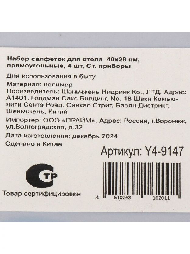Набор салфеток пластик, 40х28 см, прямоугольный, 4 шт, для стола, Столовые приборы, Y4-9147