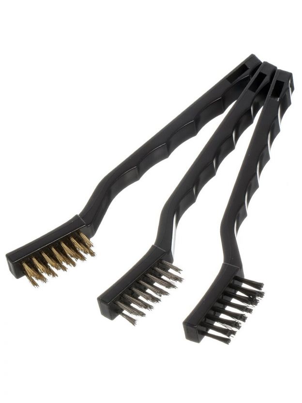 Набор щеток по металлу с пластиковыми ручками — полезный аксессуар для домашней мастерской. С их помощью легко очищаются металлические поверхности от ржавчины и запекшейся грязи. Каждая щетка оборудована стальными щетинками для грубой обработки металла. Небольшие размеры изделий позволяют быстро добраться до наиболее труднодоступных мест. Пластиковые ручки удобно удерживаются в руке благодаря эргономичной форме.