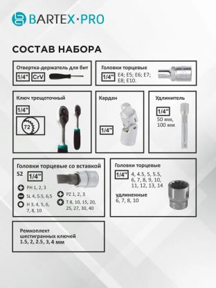 Набор слесарных инструментов Bartex, Pro, 1/4", 6-гранный, сталь, кейс, 57 предметов