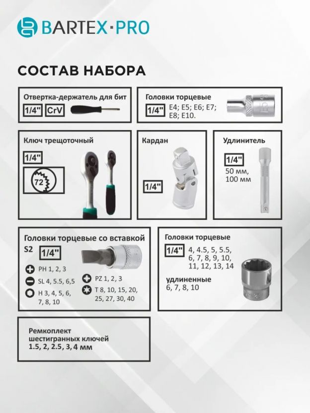 - Головки торцевые 1/4" 4, 4.5, 5, 5.5, 6, 7, 8, 9, 10, 11, 12, 13, 14; удлиненные 6, 7, 8, 10.
