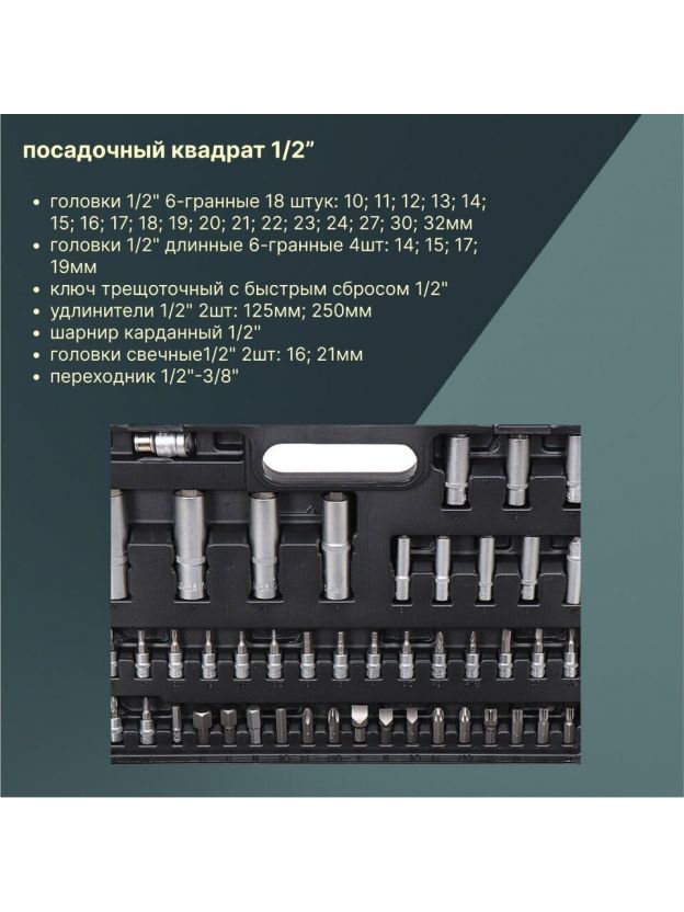 - Головки 1/2" 6-гранные 18 штук: 10; 11; 12; 13; 14; 15; 16; 17; 18; 19; 20; 21; 22; 23; 24; 27; 30; 32мм