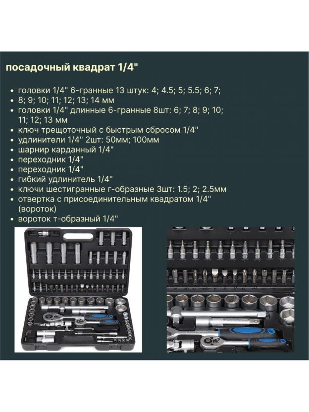 - Головки 1/4" 6-гранные 13 штук: 4; 4.5; 5; 5.5; 6; 7; 8; 9; 10; 11; 12; 13; 14 мм