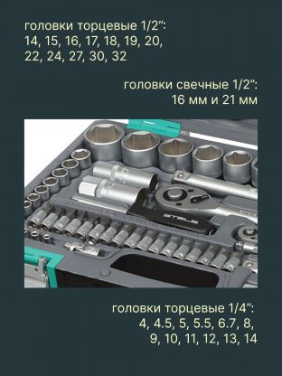 - головки торцевые 1/2": 14, 15, 16, 17, 18, 19, 20, 22, 24, 27, 30, 32 мм;