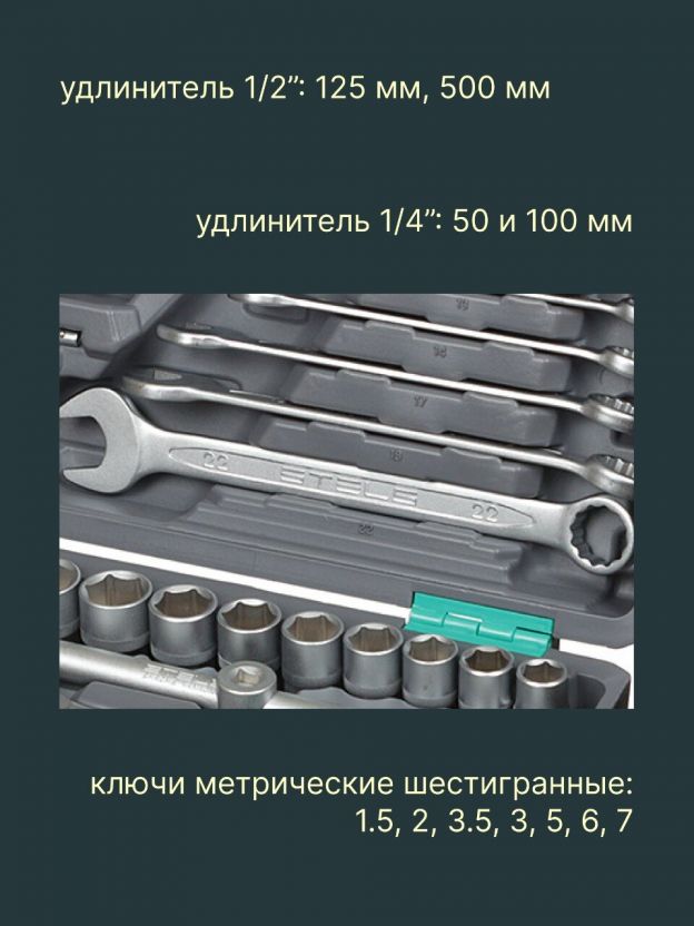 - ключ трещоточный (2 шт): 1/2", 1/4";